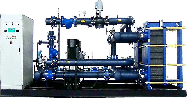 板式換熱機組,為換熱機組的一種型號,其特點是采用板式換熱器,在相同壓力損失情況下,其傳熱系數比管式換熱器高3-5倍,占地面積為管式換熱器的三分之一,熱回收率可高達90%以上。